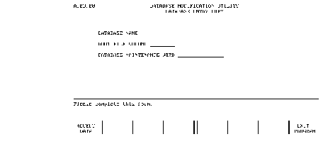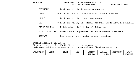 After entering all items and pressing ACCEPT DATA, the utility opens the database and displays the menu shown next. An error message indicates if the root file cannot be found or the database has already been opened by another user. If an error occurs, either re-enter another database name or press EXIT PROGRAM.