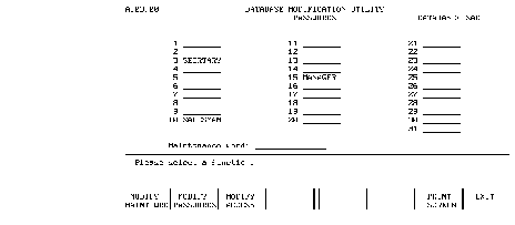 The initial menu requests the database name, root file volume specifier, and the maintenance word (if used), as shown by the following screen: