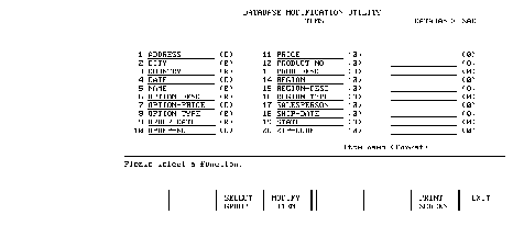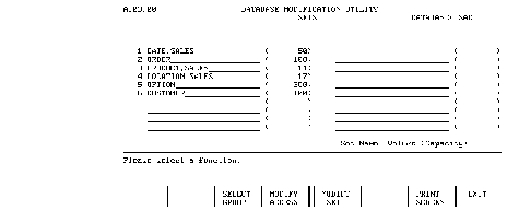 The main selection menu allows you to run any of the list and modification routines. Each is explained in the following pages. The example screens used here show information obtained from the SAD (sales analysis) database.