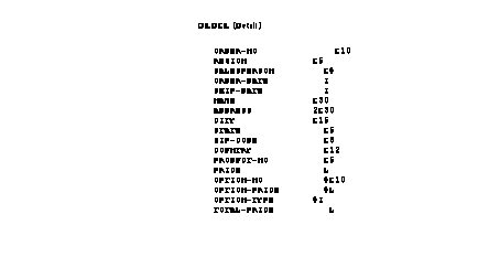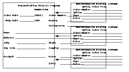 The database structure shown next utilizes a detail data set to store the option information and a master data set to store the rest of the order data. This organization of data corresponds to dividing an order into two forms, as shown in the next figure. Unlike the previous structures shown, the number of options that can be stored with any order is limited only by the number of free entries in the OPTION data set. In addition, this organization requires fewer disk space to store order information when fewer than four options are ordered. (In the previous examples, the space to store four options with each order is allocated whether the options are purchased or not.) Notice that all order numbers within the ORDER data set must be unique, since the order number is a search item.