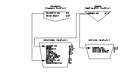 The advantages of the previous two structures are incorporated into the structure shown below. The CUSTOMER data set contains all order information except for option data, which is stored in the OPTION data set. Options are logically linked to the order through the ORDER master data set. Orders for a particular product are chained together using the PRODUCT master set.