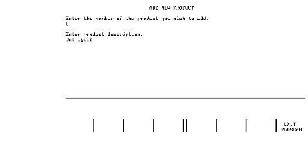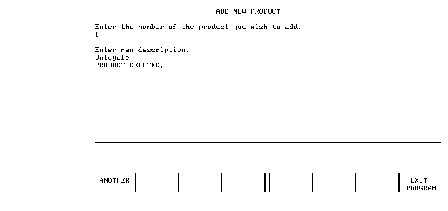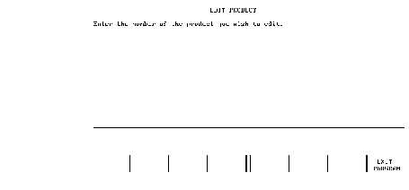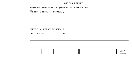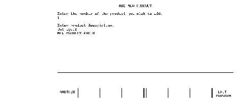 If the description is altered and RETURN is pressed, the DBUPDATE line (1520) alters the text of the product description in the database. In this case, either ANOTHER or EXIT PROGRAM is pressed to continue: