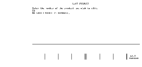 If a number is entered for a non-existent product, it is detected by the calculated access DBGET in line 1330, as shown by the following screen: