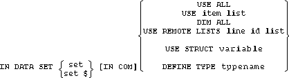 The IN DATA SET LIST statement is a non-executable statement which is referenced by an IN DATA SET with the USE REMOTE LISTS option. This option is used when the USE list is too long to store as one program line.